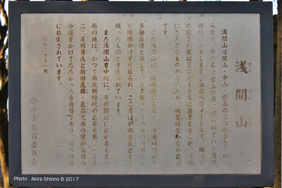 浅間山通りの上に架かる「きすげばし」 ![]() 堂山の東側には「多磨霊園」が広がります。 ![]() 堂山の東側には「浅間山通り」が通り、「多磨霊園」が広がります。 堂山の「浅間山神社」 トップへ 【浅間山】浅間山は前山・中山・堂山の三つの小さな峰からなり、その名は堂山の頂きに祀られている浅間神社に由来します。海抜八○メートルで、周囲との高さの差は三○メートルに過ぎませんが、周囲にさえぎるものがないため、眺望はなかなか良好です。 この浅間山は、地質的にみると、多摩川対岸の多摩丘陵と同じで、古多摩川やその他の河川により周囲がけずり取られ、ここだけが孤立丘として残ったものと考えられています。 また浅間山を中心に、その周辺に広がる人見ヶ原の地は、かつて南北朝時代の正平七年(1352)、足利尊氏と新田義興・義宗兄弟の軍が両朝の命運をかけてたたかった古戦場であり、都の旧跡に指定されています。 昭和六十年一月 府中市教育委員会(現地看板より引用) |