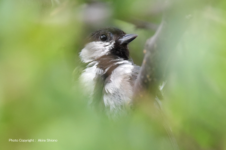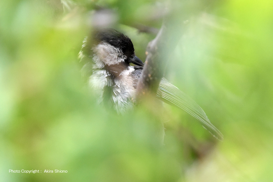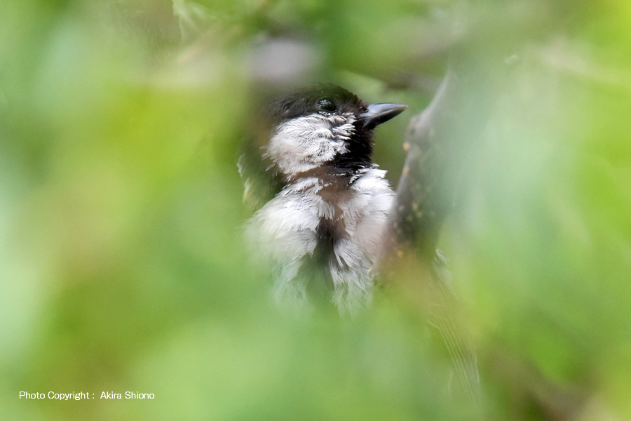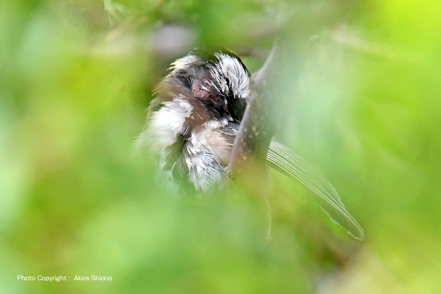 シジュウカラはスズメと同じく、住宅地などでもよく見かける野鳥です。大きさは約14cmでスズメとほぼ同じです。鳴き声(さえずり)はスズメが「チュンチュン」と鳴くのに対して、シジュウカラは「ピューチュ ピューチュ ピューチュ」や「ツィピーツィピーツィピー」と疳高い声で鳴きます。 (画像をクリックすると拡大します) 盛夏の木陰のシジュウカラ トップへ 左上の写真は、初春の梅の枝に留まるシジュウカラです。気温の低い時期では保温の為に羽毛が隙間なく埋め尽くされています。しかし気温が30℃近くになると、体の放熱のために羽毛は隙間を作っています。下の写真が生い茂る梅の葉の間から見つけた8月間近の写真ですが、暑い盛夏羽繕いを2〜3分行なっていました。見た目も毛(羽)並みが整っておらず黒い部分が焦茶に見えるなど、一見他の鳥に見えてしまいます。