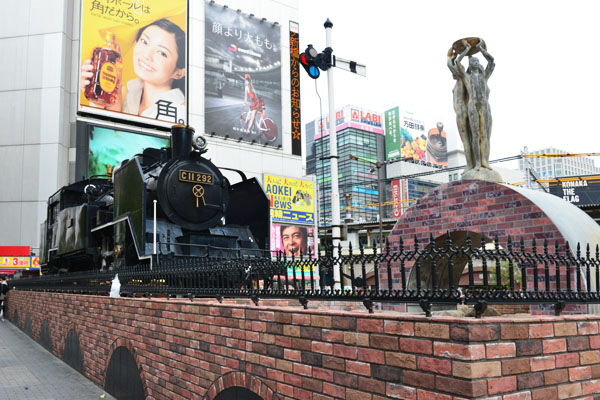 ![]() 左ー通称「新橋SL広場は小さな子供達に人気。 右ー反対側から見たC11のSLで右奥が新橋駅。