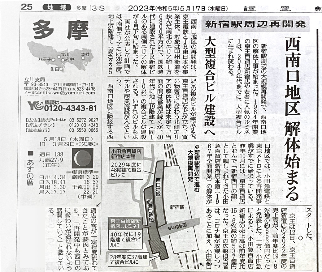 ![]() ロバート・インディアナの「LOVE」オブジェクトと新宿アイランド時計 ![]() 北通りの新宿警察署裏の交差点は青梅街道、甲州街道の分岐点。正面は損害保険ジャパン本社ビル 新宿西口駅前の景色 小田急百貨店 2014.12.18 トップへ 新宿駅西口再開発により2022年10月2日(日)をもって営業終了し、50年営業した建物は解体されました。また新宿西口の新しい顔ができます。 小田急百貨店新宿店本館は解体されたのち、その跡地にはオフィス機能と商業機能を備えた、東京都庁よりも高い地上48階・高さ260メートルと超高層ビルが建つ予定です。小田急ハルクは残っています。 ![]() 新宿駅前の駅前ロータリー正面には、小田急デパート、地下には新宿駅の入り口があります。 ![]() 新宿駅西口に並ぶ小田急百貨店と京王百貨店(2017年) ![]() 駅から小田急ハルクに向かうペデストリアンデッキへの階段。 ![]() 小田急ハルクから駅に向かうペデストリアンデッキ向かいは小田急デパート 新宿西口再開発 読売新聞多摩版2023.5.17 掲載記事 トップへ 新宿西口近くのビルから見た駅周辺の景色 2017.8.6 トップへ 移 動: ここ20年で変わった街の景色 コクーンタワー ドコモ代々木ビル 東京都庁第一本庁舎 西新宿の高層ビルマップ 超高層ビルトップ20 東京都庁第一本庁舎 新宿駅南側のタイムスズクエアー バスタ新宿建設中当時の新宿南口 新宿高層ビル街周辺の景色 新宿西口駅前の景色 新宿西口駅前の景色 小田急百貨店色 新宿西口再開発の記事 新宿高層ビル街周辺の景色 リンク: 外部リンク:新宿駅西口再開発事業(仮称) 28階から新宿西口周辺 新宿御苑 南エリア 新宿御苑 北エリア 午後〜夕刻の新宿周辺 新宿駅南口のバスステーション;バスタ新宿 高い位置から見た新宿西口南方面 高い位置から見た新宿西口南方面 世界貿易センタービル 再び脚光を浴びる 東京タワー 東京スカイツリー 桜木町 日本丸 甦った建築物/東京駅丸の内駅舎復原工事 浜離宮恩賜庭園 小石川後楽園 |