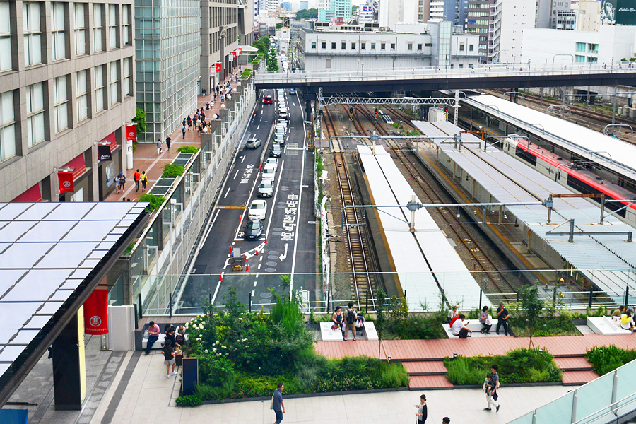 新宿駅南口2階デッキからみたタイムズスクエアーデッキと、連絡ブリッジから見た新宿駅 (2016)