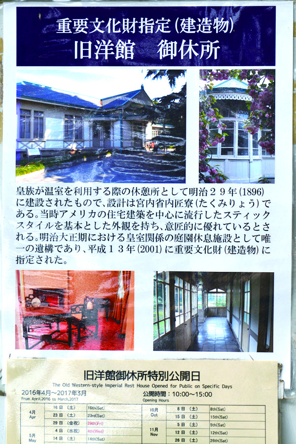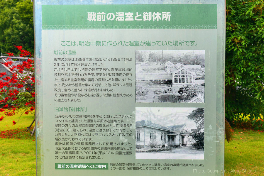 新宿御苑は、新宿区と渋谷区にまたがっています。苑内にある「上の池」、「中の池、「下の池」のラインに近い位置で北部が新宿区、南部が渋谷区になっています。 フランス式整形庭園 トップへ イギリス風景式庭園 トップへ 玉藻池 トップへ 大温室 トップへ 戦前の音質と御休所 戦前の温室は、1896(明治29)にかけて順次建設されました。これらは日本では初期の温室であり、農業試験場的役割や宮中で使われるそ采、果実並びに装飾用の花弁を生産する皇室御用の農場の役割などを担いました。また、海外から種苗を集めて栽培した他、洋ランは品種改良も含めて盛んに栽培が行われました。 その後増設や移設などを繰り返し、戦後に建替えの為に撤去されました。 設置看板「戦前の温室と御休所」より 旧洋館(御休所) トップへ 重要文化財指定 旧洋館 御休所 旧洋館「御休所」当時のアメリカ住宅建築を中心に流行したスティック・スタイルを貴重をした※瀟洒(しょうしゃ)な洋風木造建築です。 皇族の方々の温室ご鑑賞時の御休所として1896年(明治29)に建てられ、温室と渡り廊下でつながっていました。大正時代にはクラブハウスとして数度の増改築が行われています。 戦後は御苑の管理事務所として使用されました。明治大正期における皇室関係の庭園休憩所施設として唯一の遺構建築で、2001年(平成13)に国指定重要文化財建造物に指定されました。 (大温室前説明看板より) ※瀟洒:さっぱりしていて気がきいているさま。あか抜けているさま。 リンク: 新宿御苑南エリアはこちら リンク: 小石川後楽園西エリア世界貿易センタービル 新宿御苑南エリア芝増上寺 東京タワー 浜離宮庭園 CHSのIROIROサイト:人気ページ トップへ |
