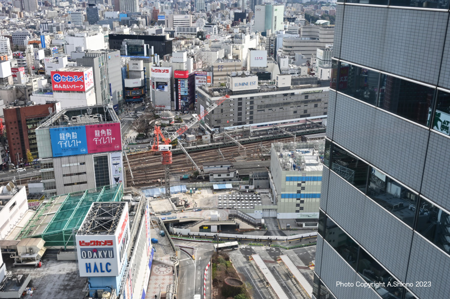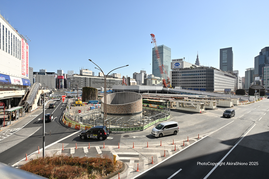 新宿ビックカメラ小田急ハルク前のペデストリアンデッキから見た景色とロータリー正面から見た建設現場
