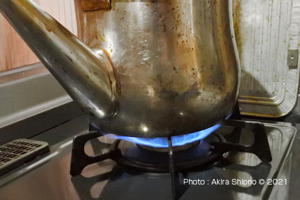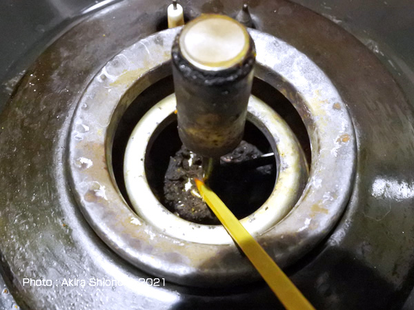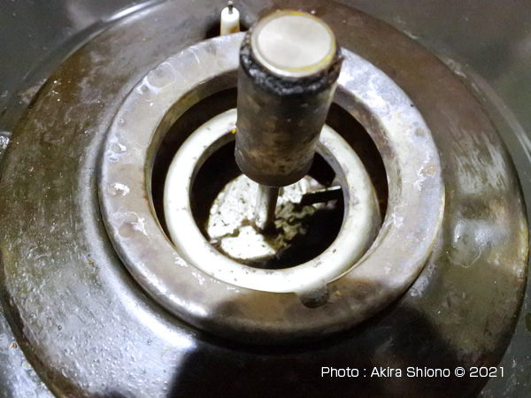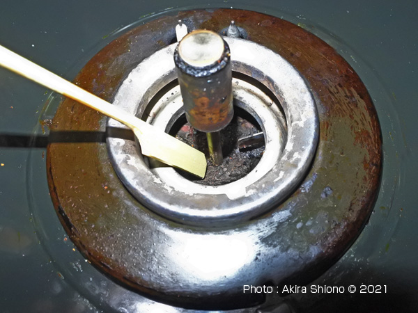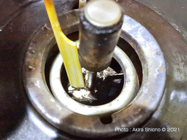 このSiセンサーコンロには、湯沸かし自動停止ボタンがあります。このボタンはなかなか便利な機能で、夜間に水を入れてコンロに着火後このボタンを押すと沸騰すると弱火になって、さらに放っておくとガスの供給が自動停止するという優れたものです。 センサー基部を清掃 トップへ ※センサー下部は細いので、カーボン削除時に力を加えると折れる可能性があります