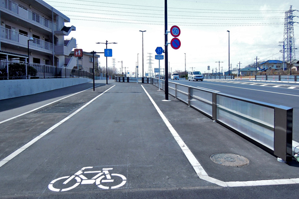 新府中街道のこの区間は両側に10㍍の歩行者道・自転車道が設けられ、中央分離帯を含んだ車幅は北行き・南行きを合わせ16mとなっていて、一般部は全て含んだ幅は36㍍となっています。