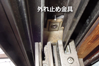 引きずりの修理と戸車の高さ調整方法 トップへ 引き戸を開閉する時に、擦っている様な音がする場合は別の作業をします。戸車の高さが低くなっていると、アルミサッシの窓枠の下部分が接触している場合があります。引き戸の中央下部側面のに樹脂の丸いキャップが付いています。このキャップを外すと戸車の取り付けネジともう一方は高さ調整のネジが見えます。もう片方は、窓枠に噛み合う様になっていますので、凹型奥にネジが見えます。上の穴が戸車固定ネジで、下の穴が調整ネジです。 戸車が滑らかになったのを確認して、サッシの引き戸をレールに戻します。数回開け閉めして更に戸車にグリスを馴染ませます。次に取り外した外れ止めの部品を取り付けます。このサッシは菱形の金具をサッシレール上の溝の部分に回転させて噛ましてネジを止めます。元々重い引き戸で修理前は非常に力がいりましたが、開閉すると戸車がきちんと回っている様でかなり軽くなりました。 日頃のメンテナンス/高さ調整 トップへ
