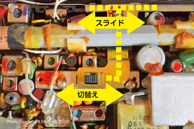 見た目は大きな外傷もなく問題ありません。ACアダプターのプラグをソケットに差し込んで、スイッチを押し込んでみました。 内部の状況を見る トップへ すでに50年を過ぎているこの家電は、様々な部品が問題を起こしている可能性があります。内部にアクセスするには、背面の2本の#2ビスを外せば裏蓋がハスれます。問題の上面にある選波用のレバースイッチを辿っていくと、下方に伸びる逆L字型のプレートの先にスイッチがあります。これが問題のスライドスイッチです。ここの接触が悪くなっていることが分かりました。しかし、ご覧の通りコンデンサーなどの部品がギッチリ詰まっていてこのスイッチにアクセスできません。周りからエアダスターを吹き込んでみましたが、僅かな隙間も見つかりませんでした。 FMバンドが幾分広く、ワイドFM端は受信可能 トップへ