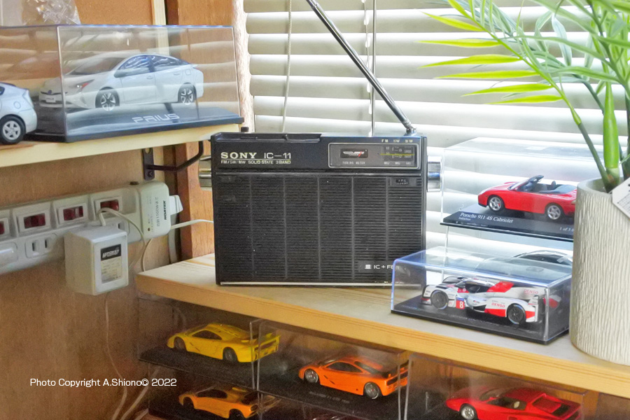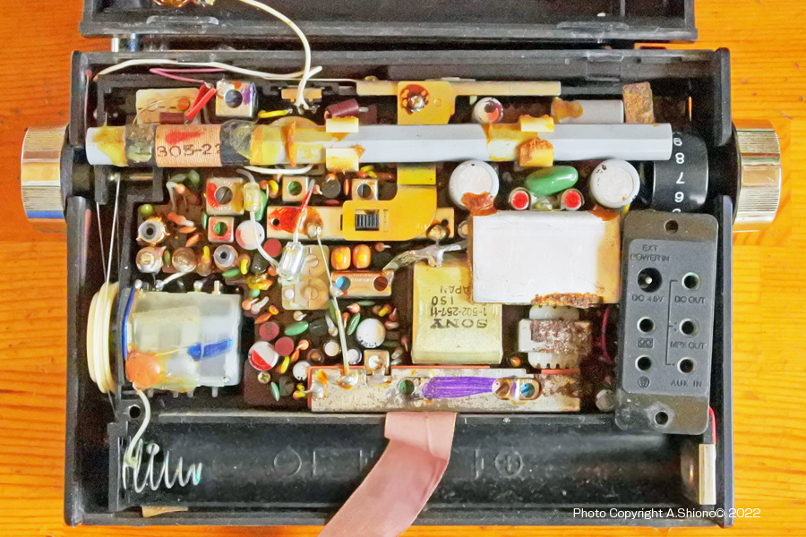 ラジオ好きの1971年製ラジオの復活 移 動: バリバリ音がするIC-11 IC-11の状態 内部の状況を見る ワイドFM端は受信可能 リンク: カードリモコンの修理 エネループ充電器の修理 ガスファンヒーターの運転スイッチの修理 修理に使う道具 マウス内部の清掃 バリバリ音がするIC-11 トップへ この写真は、東京オリンピック開催から7年後くらいに発売されていたソニー・アイシー・イレブンです。1971年のラジオでカセットラジカセが出る前まで活躍していたラジオです。バンドはAM,SW,FMの三波ラジオで当時としてはハイスペックな一流メーカー「ソニー」のフラッグシップでした。小型ながら音質も良くお気に入りのラジオでした。しかしこの後、カセットテープエアーチェック(番組録音)が出来る「ラジカセ」が主流となり、単機能のラジオの出番はあまりなくなってしまいました。 こんなことから役目を担ったラジカセでしたが、機械部分やテープを送る軸とゴムの汚れなどのメンテナンスが必要で、機械式の操作メカの摩耗などで比較的短命でした。それに比べて電波を受信して音声を鳴らすラジオは機械的な部分が比較的少なく延命してきました。そんな置いてきぼりにされたラジオですが、ひょんな事から仕舞っておいた引き出しから出てきました。運良くACアダプターも発見でき、このプラグを本体背面にソケットに挿して鳴らしてみることにしました。 IC-11の状態 トップへ