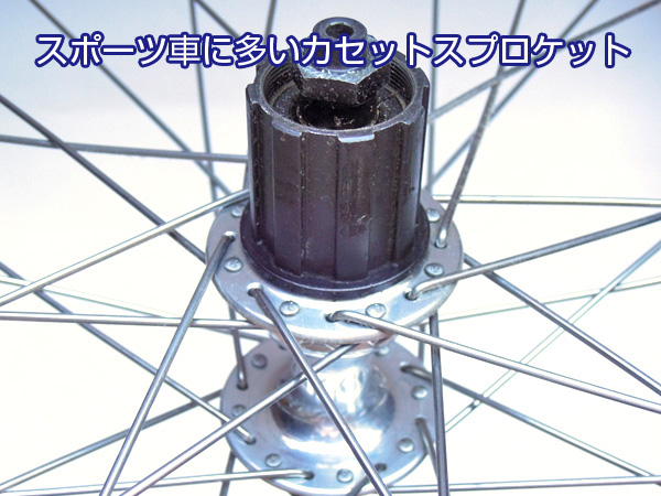 【ステンレスが錆びない訳】ステンレスには鋼鉄の表面に薄いクロムの酸化膜が作られたものです。食事に使うカトラリー(フォークやスプーン等)に使われている18-8ステンレスは、クロムとニッケルの比率で、クロムが18%、ニッケルが8%、残りが鉄で構成されています。薄い皮膜なので傷がつくと錆びる可能性がありますが、通常の使用であればサビを出すことはほとんどありません。 多段変速リアハブの種類 ▲top 後輪に買増変速機が付いている自転車は、スプロケット(歯車)が障壁になってスポークをハブの穴に通すことができません。外装多段変速のリアスプロケット(歯車)はカセットスプロケットとボスフリーのスプロケット用があります。取り外すには、各々専用の工具が必要になります。ボスフリータイプはリアハブにネジが切ってあって、そこにラチェット一体型の多段スプロケットがねじ込まれています。それに対してカセットスプロケットは、リアハブがフリーハブになっていて、スプロケットが嵌め込まれています。スプロケットはフリー本体にロックリングで止められています。