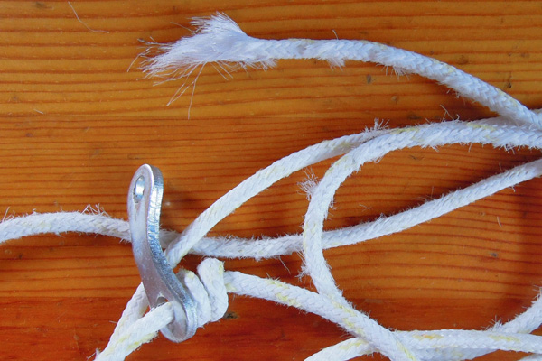 右は、この3年目に切れてしまったコードの写真です。まず、コードの表面がつや消しになって触ると粉っぽいものが指にくっ付いてきます。表面の所々に繊維が切れて毛羽立っているのが見えます。テント用のコードをサンシェードに使う場合は、毎日直射日光の紫外線に曝されるわけです。一般のテント用のコードは、長期間の紫外線照射でこのように変質してボロボロになってしまいます。
