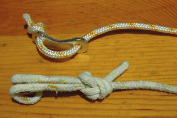 写真左ーアウトドアメーカーのガイロープは芯材が太めの1本