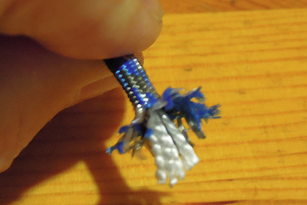 パラコードの芯は撚った複数のナイロンコードが入っています。ほつれ止めの為に火で炙ります。