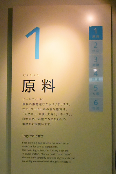 サントリー武蔵の工場の見学は、無料でインターネットか電話瀬の予約制になっています。 ザ・プレミアム・モルツ講座 トップへ 『ザ・プレミアム・モルツ講座』では、最高品質を目指す、製造にかける技術者の思い。 天然水の採取、品質管理、最高の原材料の輸入や、使用されている麦芽の試食、きめ細やかな泡の試飲などが若い女性の担当者から説明があります。 工場内見学/原材料 トップへ