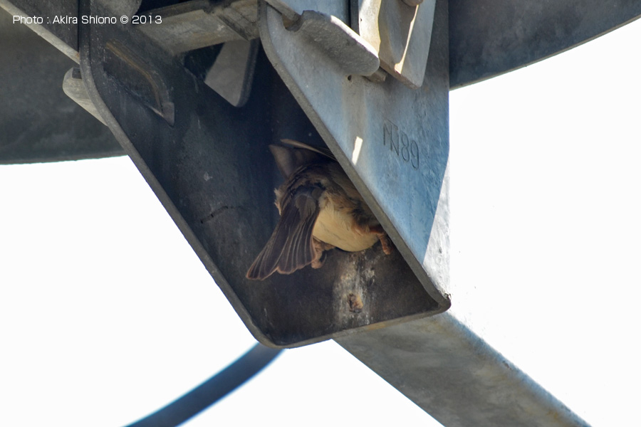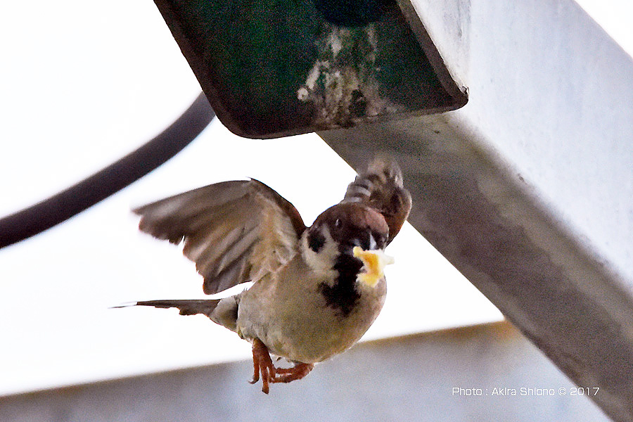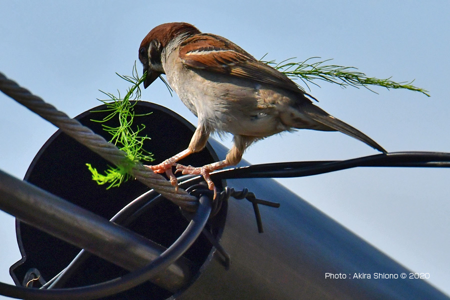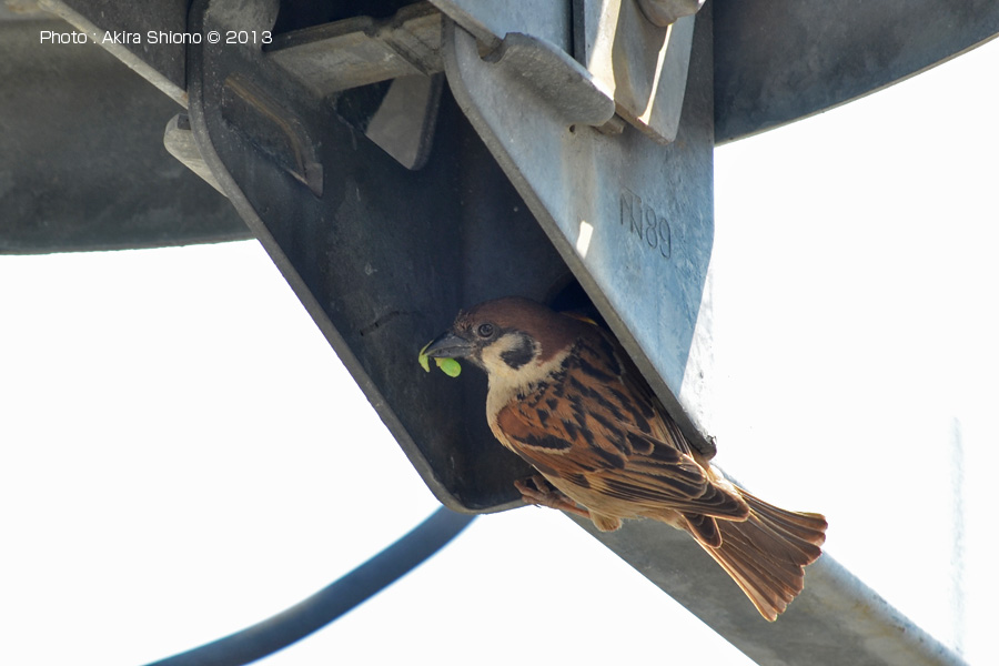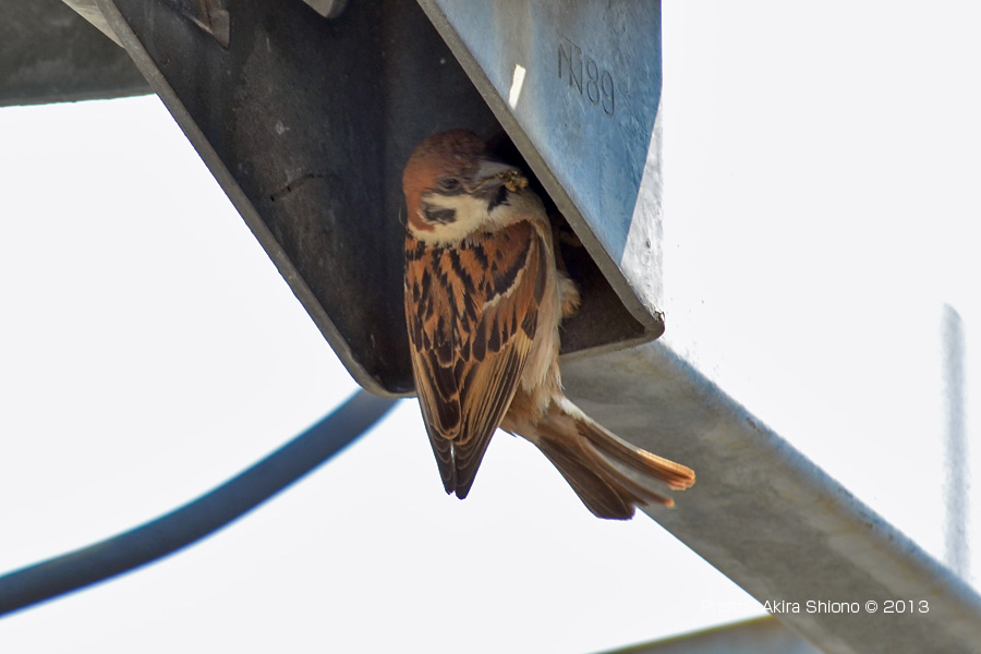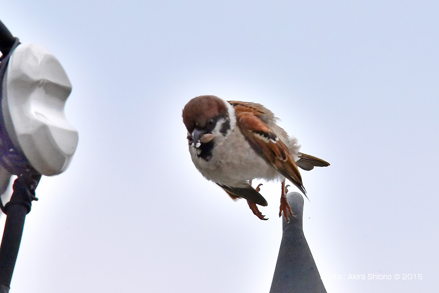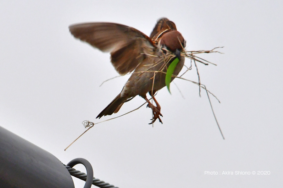 安全な巣は電柱の角パイプのステーに開いた丸い穴でこちらに餌を運ぶスズメ。 ![]() 5月下旬、白っぽい何かをくわえて、電柱の巣から飛び出すスズメ。 ![]() 5月下旬、羽の様な物をくわえて、電柱の巣から飛び出すスズメ。