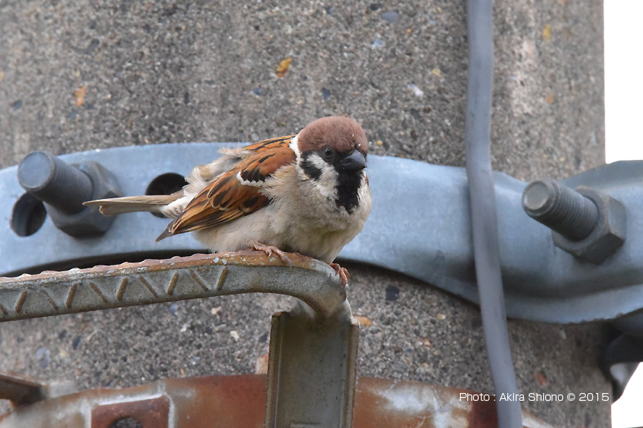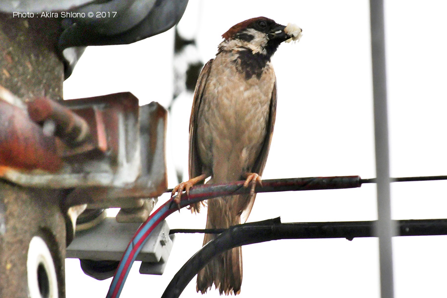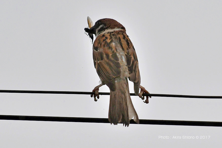 スズメはもっとも身近な野鳥です。住宅地などでも見ることができる身近な野鳥は、小さいものは14cm位のスズメ〜60cm弱のカラスを見ることができます。このスズメは、全長が約14cmと中型の野鳥です。サイズが近い留鳥としては、14cmとほぼ同じサイズのシジュウカラがいます。 ![]() 蜂の様な物を捕まえ電線の上で静かになるのを待つスズメ。 ![]() 5月下旬の捕まえた餌の幼虫を加えて、電柱の先端から飛び出すスズメ。 ![]() 6月上旬の捕まえた緑色の幼虫をくわえて、ヒナに餌をあげようとするスズメ。