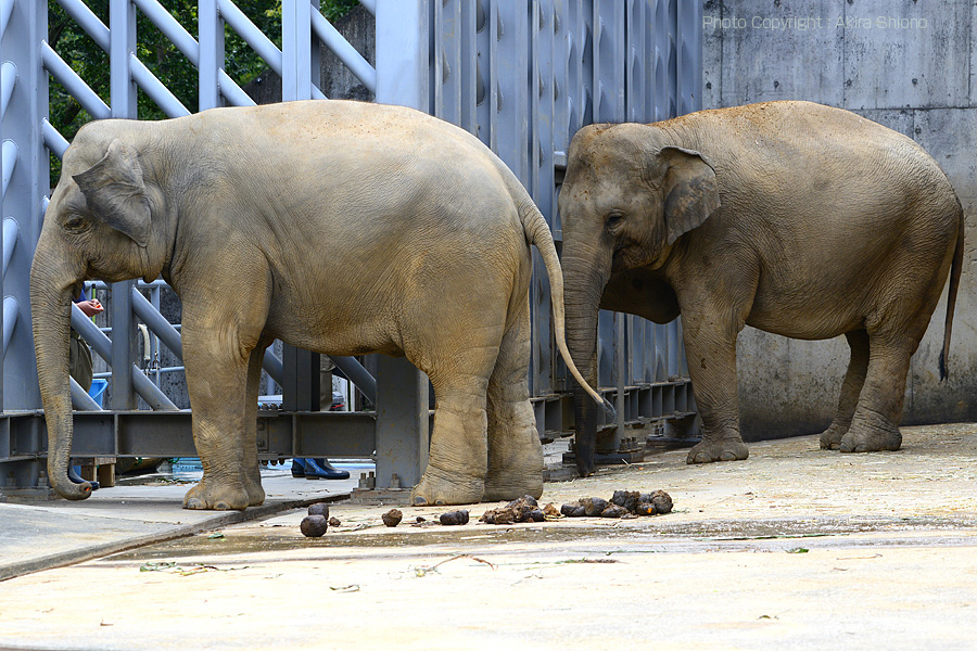 アジアゾウは右のアフリカ象と比べ丸っこい体つきで耳が小さめ。åアフリカ象はしわも一段と深い。