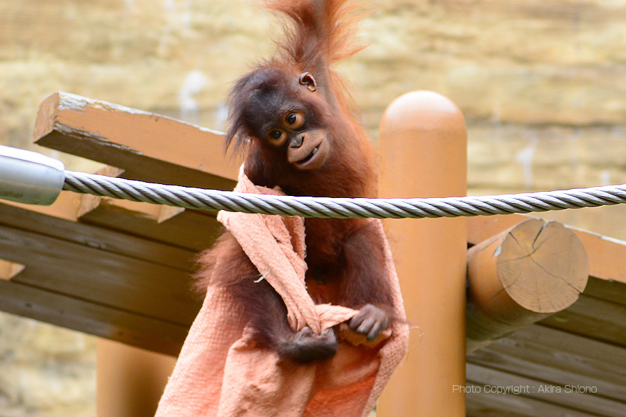2014年6月19日に生まれたオラウータンの赤ちゃん。名前は「アピ」。ぶら下がりながら布で遊んでいました。