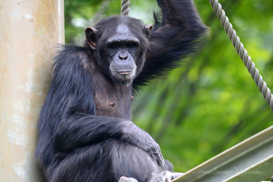 アリ塚に草の茎を入れてアリを食べています。チンパンジーエリアはニホンザルとちがって静か。