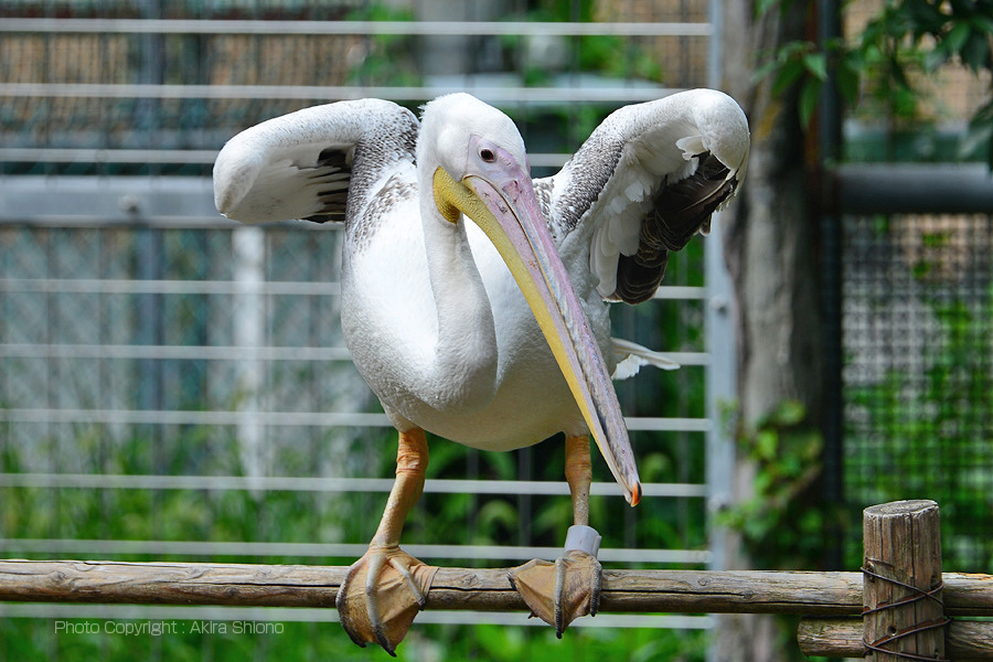 ![]() アフリカ園の広いエリアの一分にペリカンが集まっています。柵の上に乗り羽を動かすペリカン。