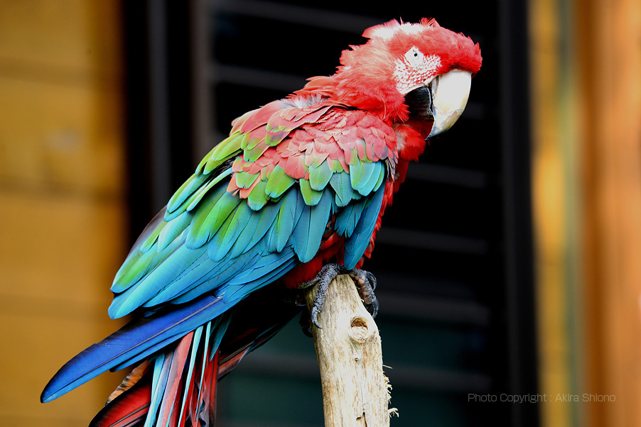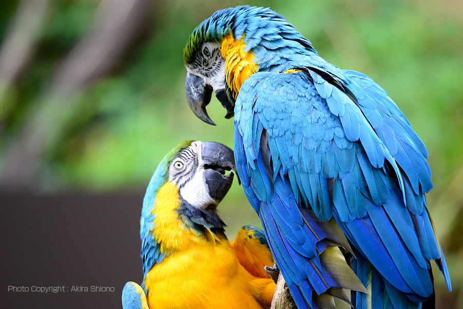 ルリコンゴウインコは青戸黄色が奇麗。喧嘩のようです。アップすると、クチバシは水牛の角の様な色をしています。 アジア園フライングケージ/猛禽類 トップへ
