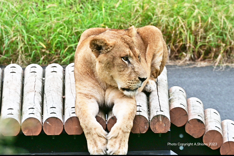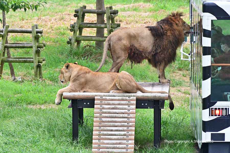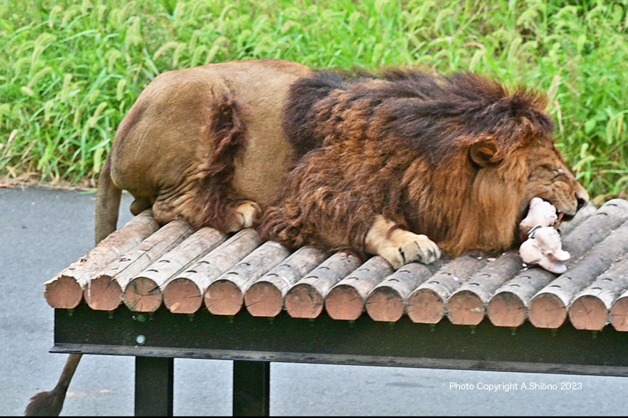 ![]() ヴォウ円鏡を備えた展望台から見えるライオンバスのコースと、展望台広場にあるライオンの説明。 撮影:NIKON Z7+T70-300mmf/4.5-6.3、Z9+Z400mmf/4.5S ![]() ライオンバスから餌をもらうオスライオン 撮影:NIKONZ7+200-500mmf/5.6 ISO2200 1/500 f/14 0段