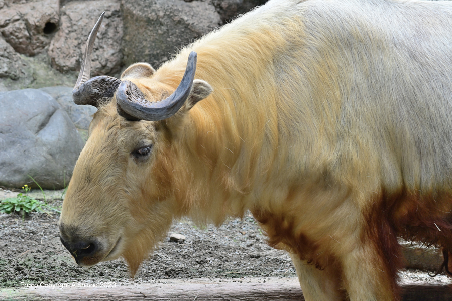 ゴールデンターキンはウシ科でヤギ亜科。メスは茶系でオスは金髪の様な明るい色 撮影:NIKONZ7+200-500mmf/5.6 500mm ISO2800 1/500 f/9 0段 シャモアの「モンブラン」が亡くなっていました トップへ 以前にここでシャモアを撮影したのが、2014年8月31日でした。凹凸を作った急斜面の高い所から身を隠しながら下の道を警戒しながら見張っていました。中々全身を表してくれずに撮れた写真はこの写真のみでした。今回もどうしているのか楽しみにしたいましたが、姿は無く看板が掲示されていました。