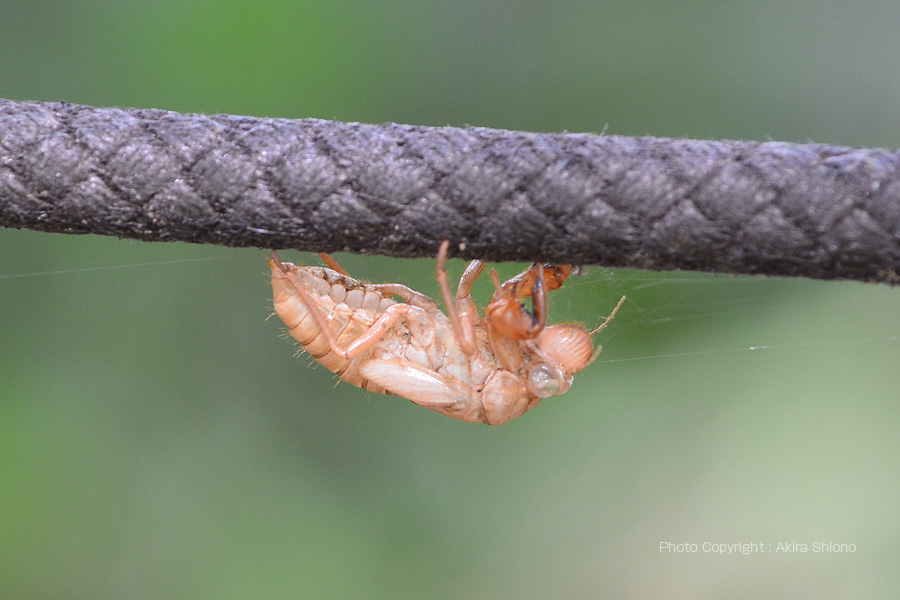 杭に張られたロープで脱皮したセミの抜け殻。これはおそらく、ミンミンゼミかツクツクボウシでしょうか?