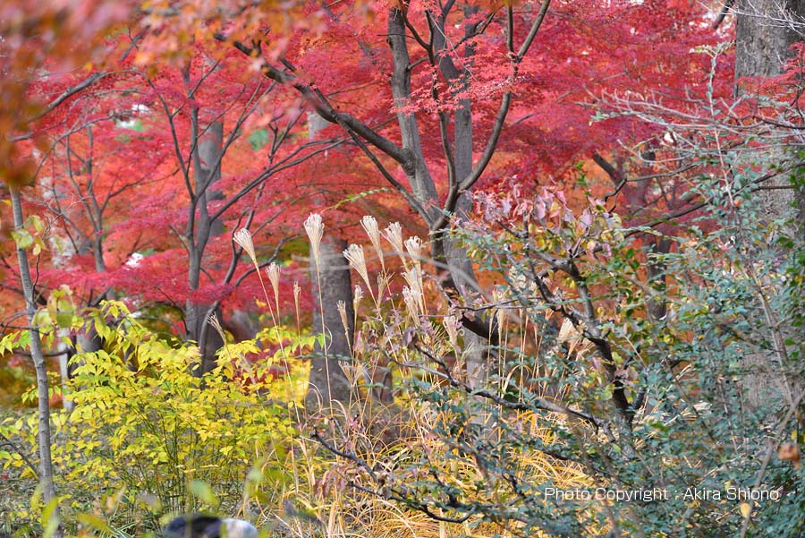 ![]() 藤棚は来初夏まで一休みで紅葉が主役に。クマザサ越しに見えるモミジはまだオレンジ色で緑とのコントラストが素敵 ![]() 竹の小径の左の丘の木々も赤く色付きこの時期の素晴らしい景色になる