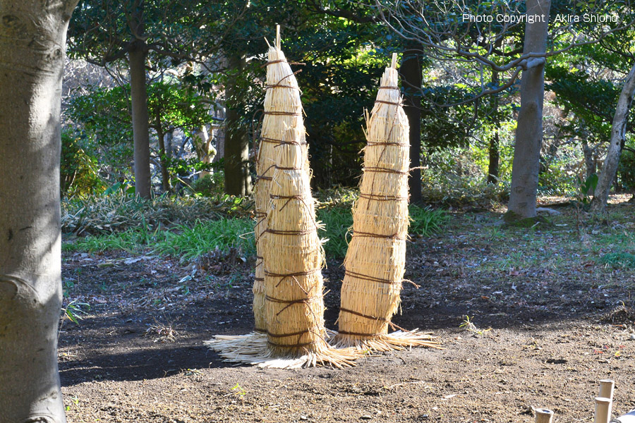 左ー藤棚は冬の準備に葉をお通して寒さに備える 右ー冬の準備に寒さに弱い低木には藁が巻かれた