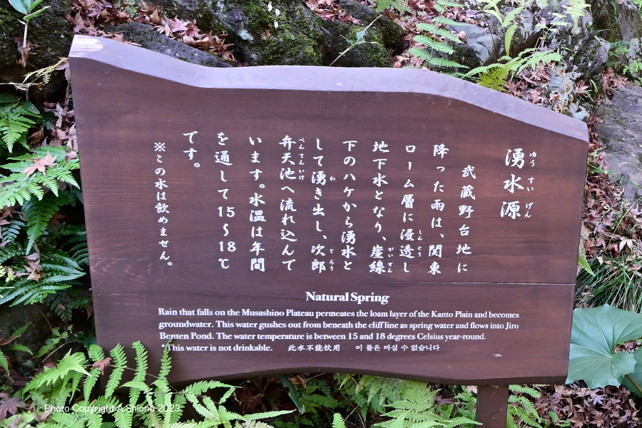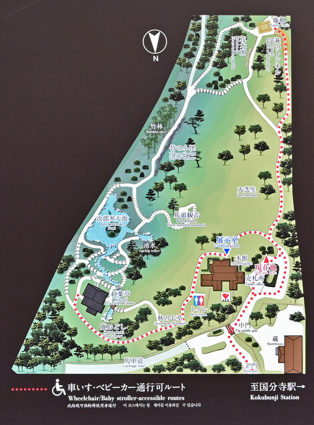 三菱合資会社の社員で、後に南満州鉄道副総裁から貴族院議員にもなった江口定條は、大正2年(1913)〜4年(1915)にこの地に別荘を構え、「随冝園」と命名しました。昭和4年(1929)に、三菱合資会社の取締役であった岩崎彦彌太が江口家から別荘を買取り、昭和9年(1934)に和洋折衷の木造母屋に建て替え、庭園建築として紅葉亭を新築するとともに、母屋全面の芝生地と国分寺崖線下方の湧水および園地を結んで、回遊式林泉庭園を完成させました。 ![]() 殿ヶ谷戸庭園の東側は崖線になっていて、湧水からの清水が弁天池の水を湛えています。