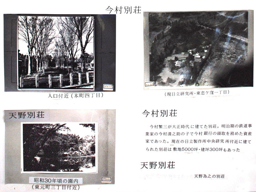 戦前にはこの岩崎家の別荘と、国分寺町第一小学校、都営住宅があった以外にはほとんど建物はありませんでした。戦後には財閥解体で三菱財閥の岩崎家の持ち物であったこの別荘は、当時の3分の1の現在の大きさまで縮小されました。昭和31年に国分寺駅南口が開設に伴い、南口も次第に商店などが出来にぎやかになってきました。 大正時代、国分寺は別荘地でした トップへ 上の画像と地図は、殿ヶ谷戸庭園内にある展示室に貼られていた、大正時代の別荘地図です。今では考えられませんが、この頃国分寺は自然が豊かで交通の便が良い都心から近い別荘地でした。この地図には6箇所の当時の別荘地が描かれています。地図の1番は、野川のもみじ橋の辺りで現在も面影があります。2はここ殿ヶ谷戸庭園になる前の江口別荘でした。3はおそらく現在の知念医院(現南町3町目交差点の多喜窪通り西)辺りと思われます。4は、現日立製作所中央研究所です。5は、府中街道の現恋ヶ窪ショッピングセンター(サミット)の辺りです。6は国分寺一中の北側と思われます。現中研(日立製作所中央研究所)は、何2回の庭園公開を行なっていますが、国分寺崖線を利用した起伏があり、清水が湧き出て池があるなど別荘地には適した場所であることがわかり、当時の国分寺の風景を想像することが出来ます。