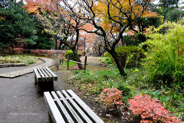 ![]() 殿ヶ谷戸庭園内にはベンチで紅葉の時期には景色を楽しめます。丘の下には次郎弁天池が見えます。
