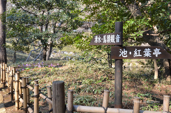 ![]() 早春の庭園の東側の丘の下にある竹の小径と次郎弁天池周りには湧水、馬頭観音、紅葉亭があります。
