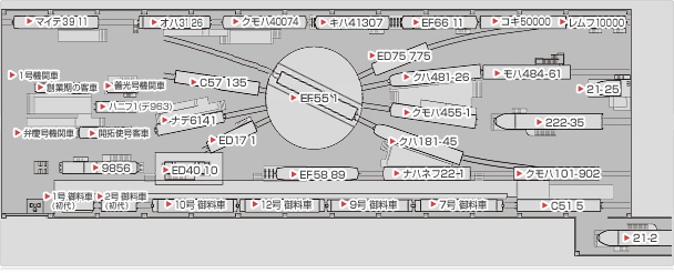 鉄道博物館1階にある鉄道車両の配置図(鉄道博物館サイトより) ![]() 鉄道博物館2階から見下ろせる1階の鉄道車両展示 初代の蒸気機関車 明治時代〜 トップへ