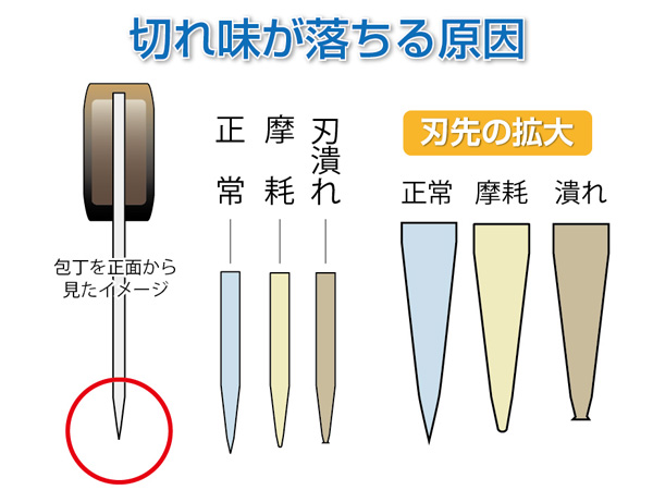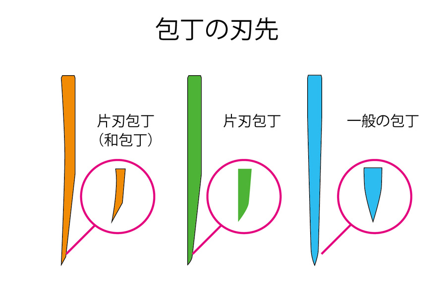 刃物は、購入時はとても良く切れますが、使って行くと段々切れ味が悪くなります。切る物が柔らかくても、素材を切る時にまな板に強く当ったり、また魚の骨などを切ると以前の切れ味は無くなってしまいます。左のイラストにはありませんが、間違ってリブなどの骨の様に硬いものを切った時は、刃がこぼれてしまう場合があります。この時は、欠けた部分が刃になるまで削らなければなりません。 包丁の各部名称 トップへ