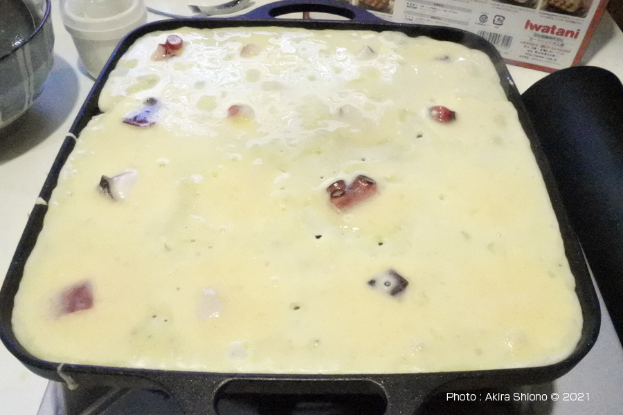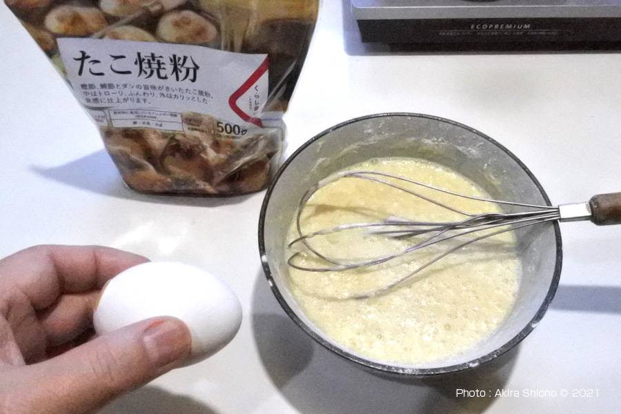 [食 材] 久々に作るタコ焼きですが、本格的にき作るには出汁が必要となりますが、今はたこ焼き粉に入っていて、使うのは、この粉100gと玉子1個と水300ccのみでこれをかき混ぜます。次にたこ焼きプレートを温め、窪みにこの溶液を八分程度入れタコを入れます。後に天かす、小口ネギ、紅生姜などを入れて、さらに残った溶液を縁迄入れて焼きます。このまま2分半程度焼きます。