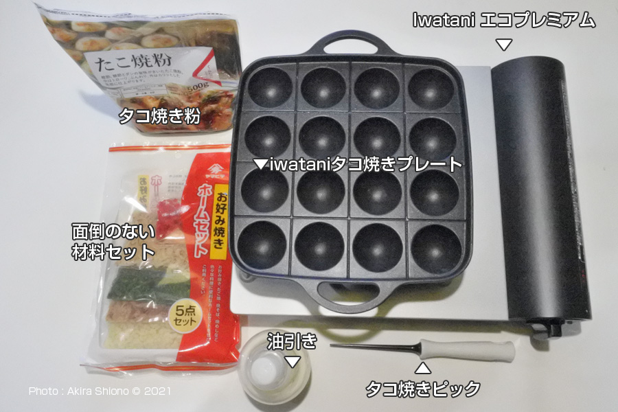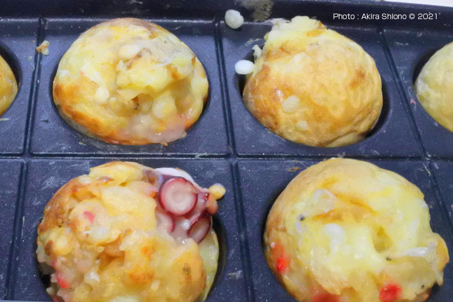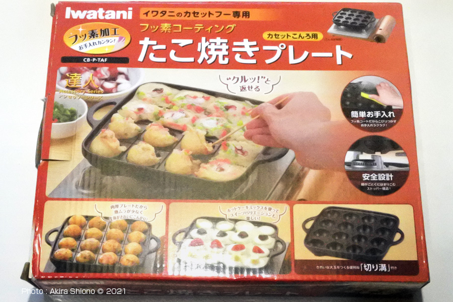 以前からカセットコンロとカセットコンロ用の鋳物のタコ焼き鉄板があったのですが、焼いた後に洗っても綺麗にならず、そこでタコ焼きとは縁がなくなってしまいました。何年経ってでしょうか、スーパーの冷凍食品で冷凍タコ焼きが売られているのを発見しました。懐かしさもあって数回購入して食べてみましたが、電子レンジで調理すると、どうしてもフニャフニャになってしまいます。味はなかなかいいのですが…そんなことからそういえばタコ焼き鉄板とガスコンロがあったのを思い出しました。 安定性の良い専用タコ焼きプレート トップへ 以前タコ焼き器(鋳物製)は、カセットコンロのゴトクとの相性が悪く、しっかり固定されないタイプでした。おまけに焦げ付きがキレイに取れないなど不満が多かった製品でした。それで見つけた電気タコ焼き器は焼き面に一応フッ素加工がしてあって剥がれが良くなっていましたが、古いものだったので面が劣化していた様です。この製品で実際作ってみました。ほどほどな感じに出来上がりましたが、どうしても火の様な火力は無いので「カリッと中フワ〜」は厳しい様です。ここでイワタニのカセットフー専用のフッ素コーティングたこ焼きプレートを使って見した。この製品の特徴としては、溢れた具材を区分けできる「切り溝」が入っていることです。また、パッケージに画像が載っていますがゴトクにピタリと合う様にタコ焼きプレートの脚にコの字型の窪みがあり焼き上げ中にプレートがずれない様に安全設計されています。 タコ焼きを作ってみる トップへ 【タコ焼き 20個分】