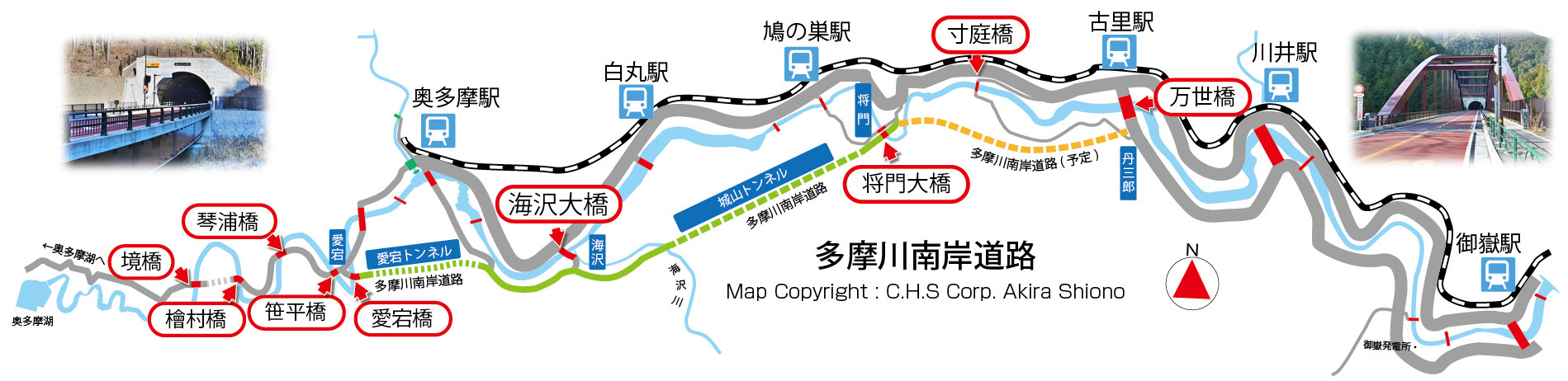 奥多摩湖方面へ時短できる多摩川南岸道路 移動: 多摩川南岸道路東入口 多摩川南岸道路東出口 奥多摩駅分岐 多摩川南岸道路西出口