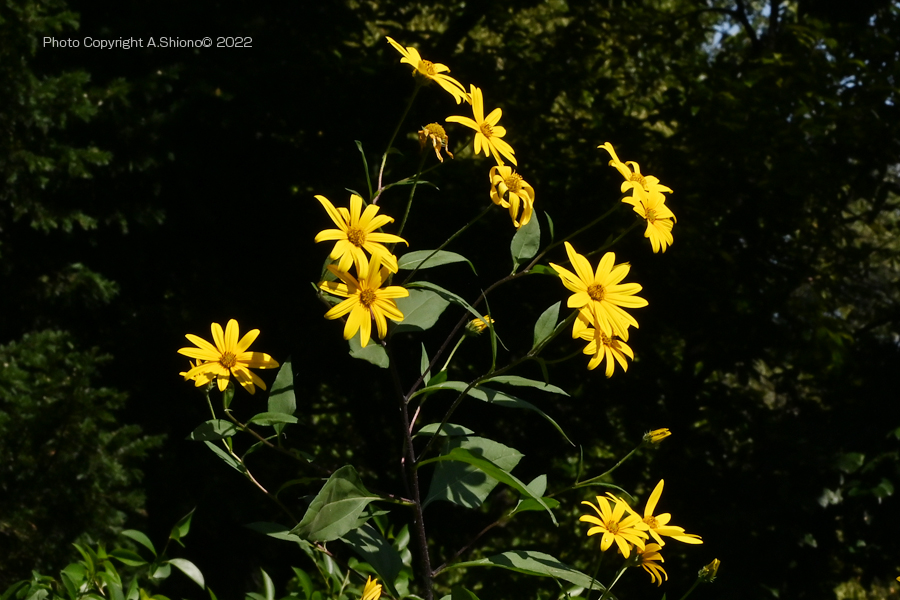 セイタカアワダチソウに留まる2匹のコバエと終焉を迎えるヒガンバナの画像 NIKON Z6II+TAMRON 70-300mmF/4.5-6.3 Di III RDX A047Z 450mm相当 ISO1000 1/200 f22〜29 手持ち 0段 陽に当たり、黒い背景に引き立つキクイモの花 NIKON Z6II+TAMRON 70-300mmF/4.5-6.3 Di III RDX A047Z DX178mm相当 ISO1000 1/200~800 f25 手持ち -2.0段