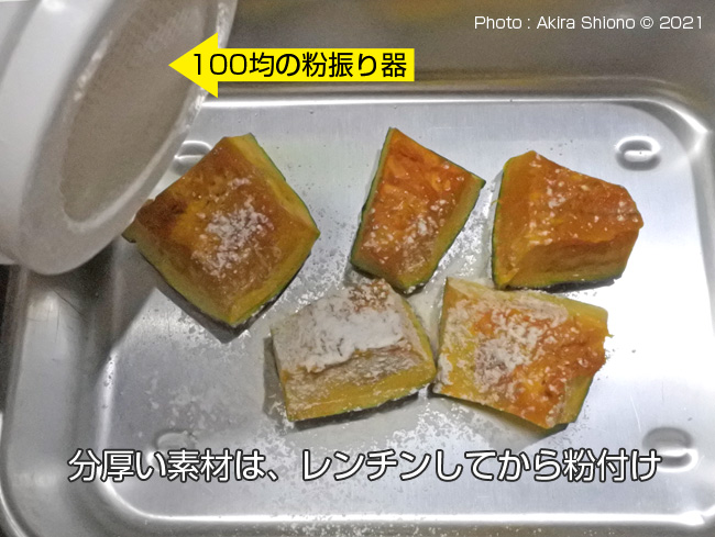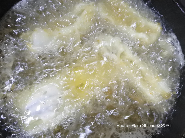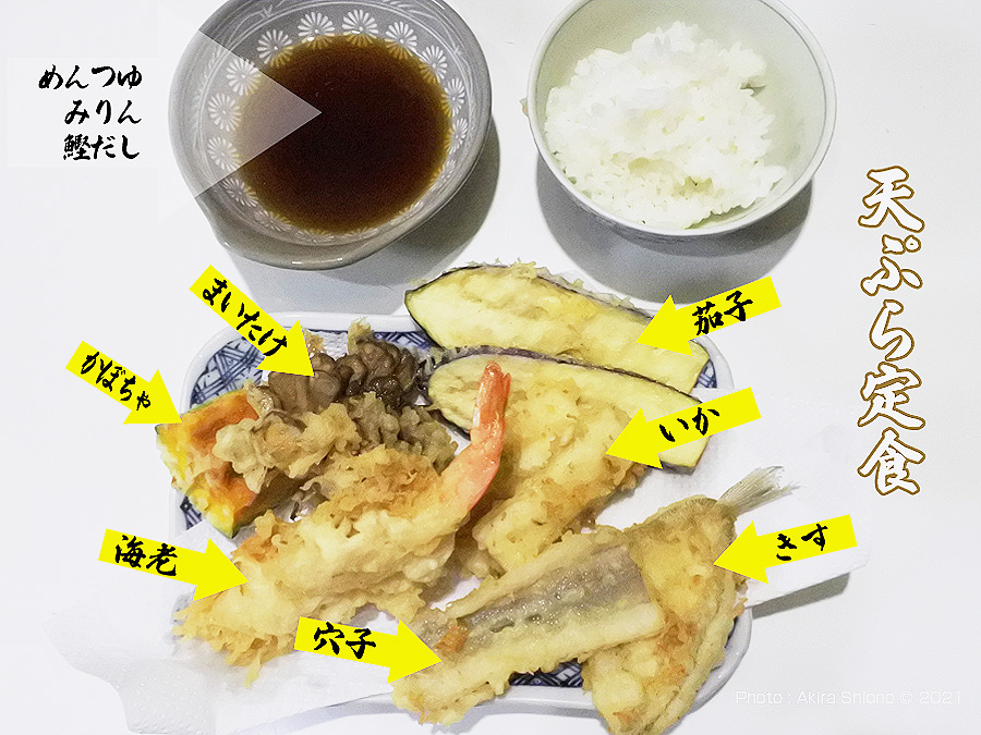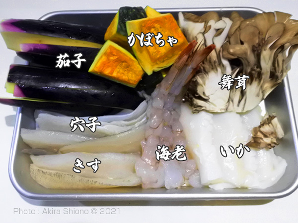 天ぷらの美味しさは一般的に衣はあまり厚く無くサクッとした歯ごたえで、衣の中の素材が油で蒸された蒸し物の様とも言われています。今までは、市販の天ぷら粉に頼っていましたが、銀座の天ぷらの有名店のKさんがTV出演された時、作り方を手ほどきいただいていました。 下準備:付け汁、盛り皿を用意しておく トップへ