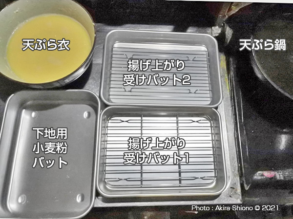 天ぷら好きの方は、スーパーのーで買う天ぷらは、油でベトベトになっていて少し興ざめする方は多いと思います。天ぷらが好きな方ほど飲食店の揚げたてのサクッとした美味しさは忘れられないと思います。衣は市販の天ぷら粉もいいのですが、薄力粉と玉子と水のみで作ります。これがさっくりして美味しいのです。しかし、家庭でする揚げ物は手間が掛かるし、油はねで周りが汚れる、油の処理が面倒という敬遠される方が多いと思います。 天ぷらの下準備 トップへ 美味しい揚げたてを食べるために、揚げる前に下粉様受け皿(バット)油切りの網付きバット数枚の準備が整ってから作業に入りますが、一旦揚げに入ってしまうと「つけ汁」、「盛り皿」の用意などできませんので前もって用意をしておきます。「盛り皿」は揚げ上がりで脂ぎれができたものをバットから移動し、次の素材が揚がった時の為に場所を空ける役目にもなります。イメージとして、①下粉付け②衣付け③揚げ④揚げ上がり⑤油切り⑥盛り付けの繰り返しとなります。 【天ぷらの用具・ネタ・材料】