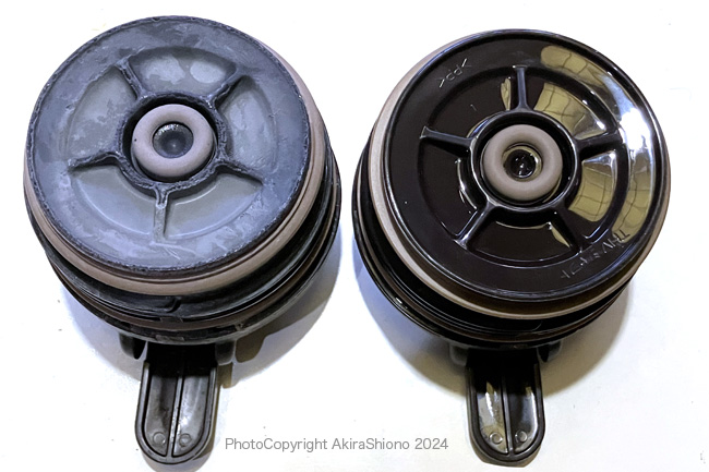 購入時には、暫くしても目立って湯温が下がらなかった高性能ポットでした。この秘密は本体の高い保温の構造と、密閉性の高いレバー付きのフタの構造にありました。この蓋はご覧の通り密閉パッキンが上下2段式になっています。 改めて中フタを観察して見ると、熱湯による樹脂の変質でしょうか?かなり変色して、素材がもろくなっていました。左は、長期間使用による水道水内のカルシウム付着した「中せん」です。 移 動: 保温が落ちたサーモス・ステンレスポット 保温が落ちる合図 新旧サーモスレ中せんの比 中せんの分解 分解してして驚く内部の汚れ リンク: サーモスケーブルの延長方法 3.5mmミニプラグ-F型接栓整合器 CHSのIROIROサイト:人気サイト トップへ |