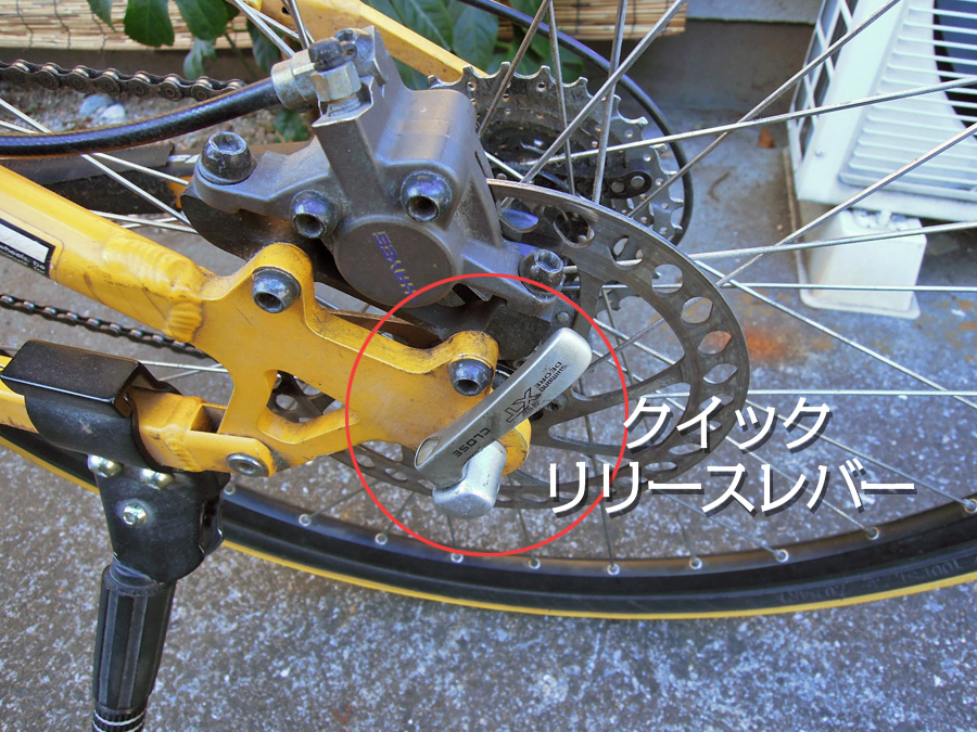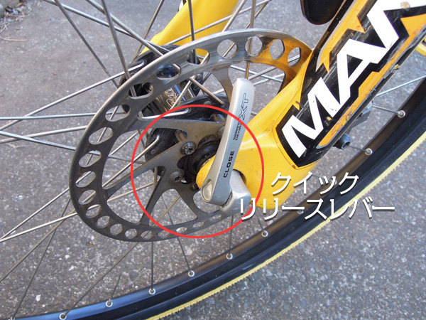 車輪を取り外す(ディスクブレーキ前輪) トップへ 一般の自転車の車輪外しはブレーキを解放しないと、外す事が出来ませんが、ディスクブレーキ仕様の自転車の車輪外しは、とってもカンタンです。車軸がクイックリリースレバーで止められているためカンタンに弛みますが、反対側ナットを弛めないと車輪を外せないフロントフォークがあります。このタイプは車輪が外せるまでナットを弛めます。 チューブを取り出しタイヤを外す トップへ