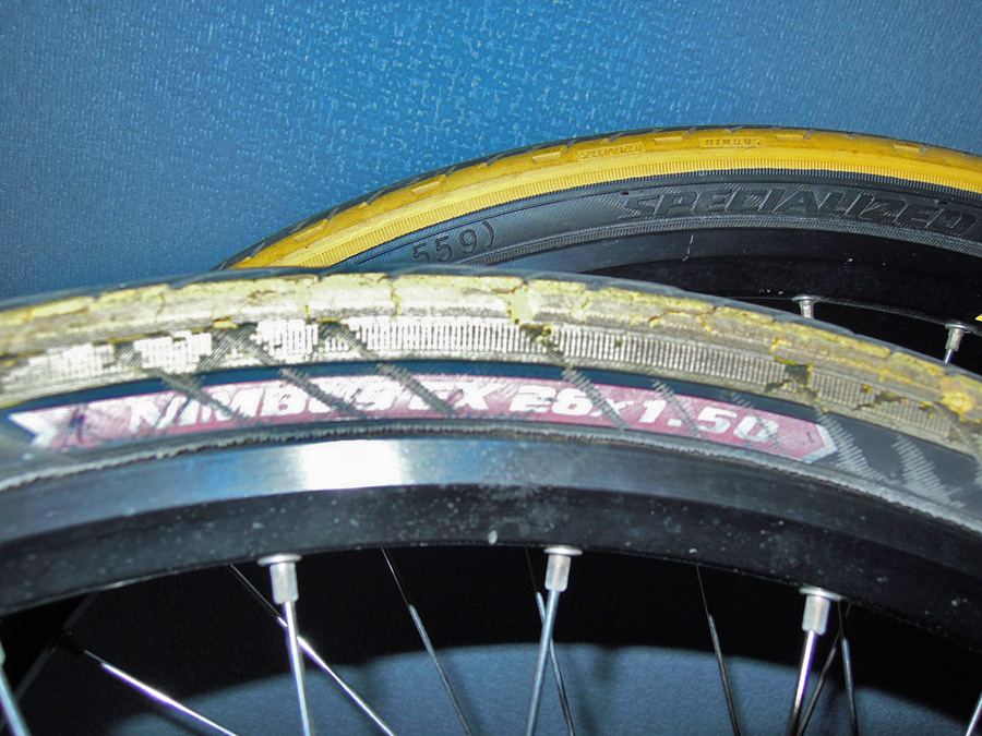 MTBのタイヤ交換 トップへ 今回は外装9段変速のMTBのタイヤ交換をやってみました。自転車のタイヤも靴と同じように、頻繁に利用していると摩耗してきます。タイヤの溝に関してはまだまだ残っていましたが、空気圧が減ったまま乗っていたいせいか、サイドの部分が写真の様に傷んできました。こういう事からも適正空気圧のチェックは大切です。この自転車は、ホイール脱着がカンタンなクイックリリースタイプなのと、ディスクブレーキ仕様なので、Vブレーキ等より取り外しはとてもカンタンです。 使用する工具 トップへ 使う工具は、タイヤレバー、車軸は工具無しで外せます。また、バルブはフレンチバルブでネジ込み式でしたので工具は使いませんでした。空気入れは、メーター付きを用意すると、空気がどのくらい入ったのかを確認でき、適正空気圧に調整する事が出来安心して乗車できます。 その他にタイヤを処分する方は、ボルトクリッパー、万能ハサミが必要です。 下記画像はアマゾン取り扱い商品ページにリンクしています修理部品と工具を見る 使用する26x1.5〜1.75インチのタイヤ トップへ タイヤを購入する前に、タイヤの側面にサイズ・形状の数字が書いてあります。 同じ型式の物でないと使えませんので、間違わない様に必ずメモしてください。 〔例〕26x1.5インチ(MTB用)など下記画像はアマゾン取り扱い商品ページにリンクしています 修理部品と工具を見る 車輪を取り外す(ディスクブレーキ後輪) トップへ
