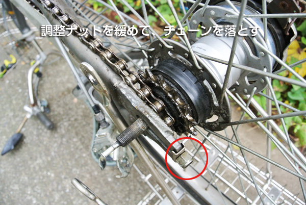 ![]() 内装変速機カバーを外し、チェーン側の後車軸のナットを緩めます。車軸調整なっとを緩めます。