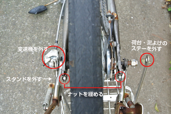 写真の赤丸niha, スタンド、後ろカゴ、泥除けのステーのナットを緩めます。右は各ステーなどを外した状態。 車輪を取り外す ▲top