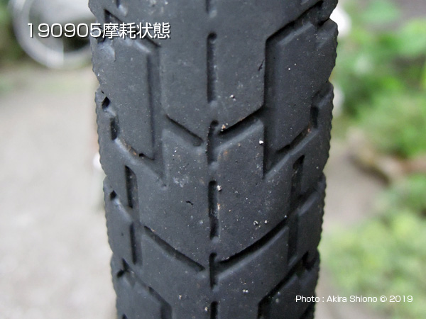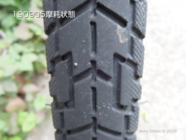 この耐摩耗タイヤは、肉厚のチューブとのセットになっていて、JHで1セット¥1,880となっていましたので、前後ですと¥3,760となります。ついでにお店で交換すると、前後で¥3,000となっていましたので、お店でこのタイヤを選んで交換した場合は手数料を含め¥6,760となります。DIYの時はタイヤとタイヤレバー(500円程度)が必要になります。 3年2ヶ月後(2019.9.5)の摩耗状態(1日の走行:約3km)