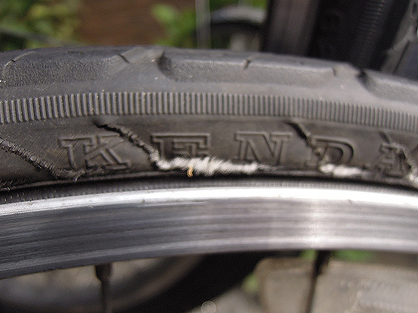 ペダルメンテ外装変速自転車の後ろタイヤ交換 トップへ 今回は外装7段変速の700cのタイヤ交換をやってみました。自転車のタイヤも靴と同じように、頻繁に利用していると摩耗してきます。タイヤの溝に関してはまだまだ残っていましたが、空気圧が減ったまま乗っていたいせいか、サイドの部分が写真の様に傷んできました。こういう事からも適正空気圧のチェックは大切です。話はそれましたが、前輪は取り外しが楽なため比較的短い時間で作業を終えられます。複雑な作業だった買物自転車の後輪の取り外しとはと違って、Vブレーキ装着の荷台の無い外装変速自転車の場合は、比較的取り外しがカンタンです。 アマゾン取り扱い商品ページにリンクしています