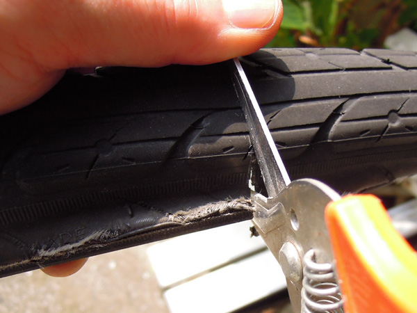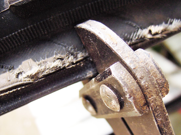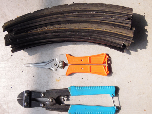 後輪をリアハンガーに戻します。この時に例ディレイラーを起こして、チェーンをスプロケットに掛けながら、下ろします。後輪のシャフトがリアハンガーに収まっているのを確認します。 使用済みのタイヤを小さくする トップへ タイヤのリムに当たる部分は、強度が必要なためにケブラー繊維や金属が使われています。普通のタイヤは、ワイヤービードとなっています。本体はゴムと布で出来ていますので万能ハサミで切れますが、縁の部分はボルトカッターでないと切れません。小さくして捨てるには、8等分にすると自治体で指定されている10Lの袋(当自治体ではM)に入ります。 ハブメンテ LEDライト チェーンホイール CC/BB保守 ワイヤー潤滑 ブレーキ交換 Vブレーキ交換 外装変速タイヤ交換 チェーン交換 ワイヤー交換 パンク修理 注 油 適正空気圧 リムの振れ取り スポーク修理 BBメンテ ペダルメンテタイヤを小さくして捨てる事が出来る工具を見る