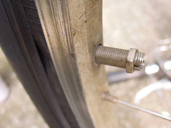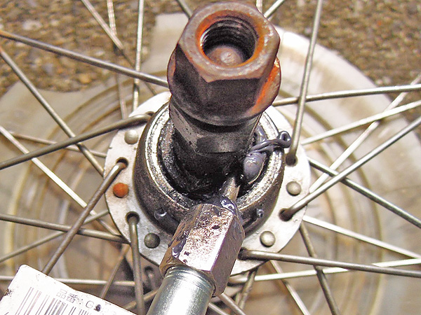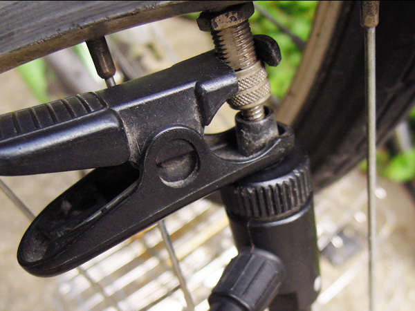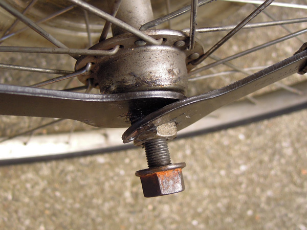 車軸を両手で持って持ち上げ、タイヤを回して違和感が無いか確認します。締め込みすぎると回転しなくなり、少しの締め込みでも「ゴリゴリ」回ります。逆に締め込みが緩すぎると隙間が出来、左右にガタガタと揺れます。タイヤを回転させながら最適位置を探ります。最適位置が見つかったら、ナットを締め込みます。 後輪をフレームに戻します トップへ
